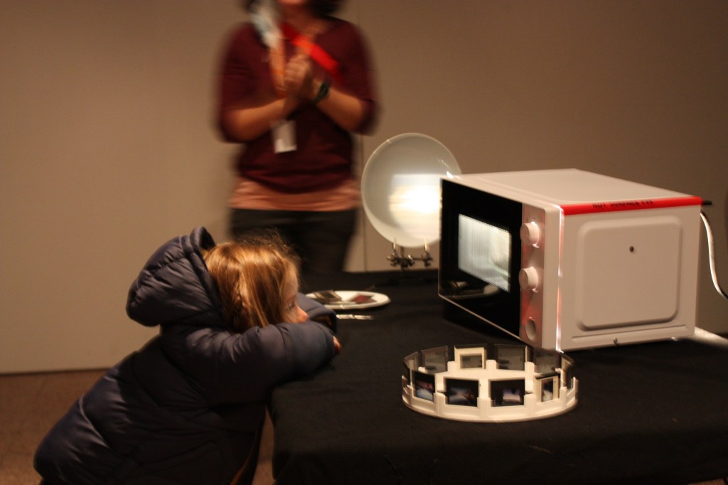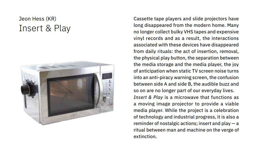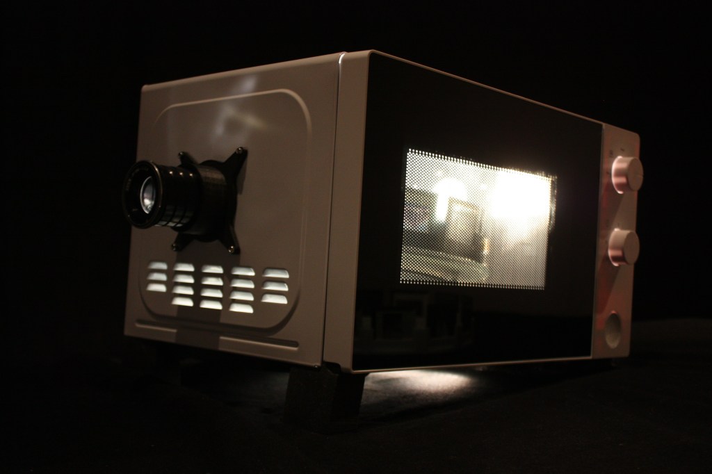 Catalog image from Ars Electronica Festival 2019 displaying ver.1.0.ver.2.0 was repurposed from an IKEA microwave and a vintage slide projector from 1960s.Viewers were invited to change “pizzas” which contained photograph slides.The image projects onto a plate while spinning.