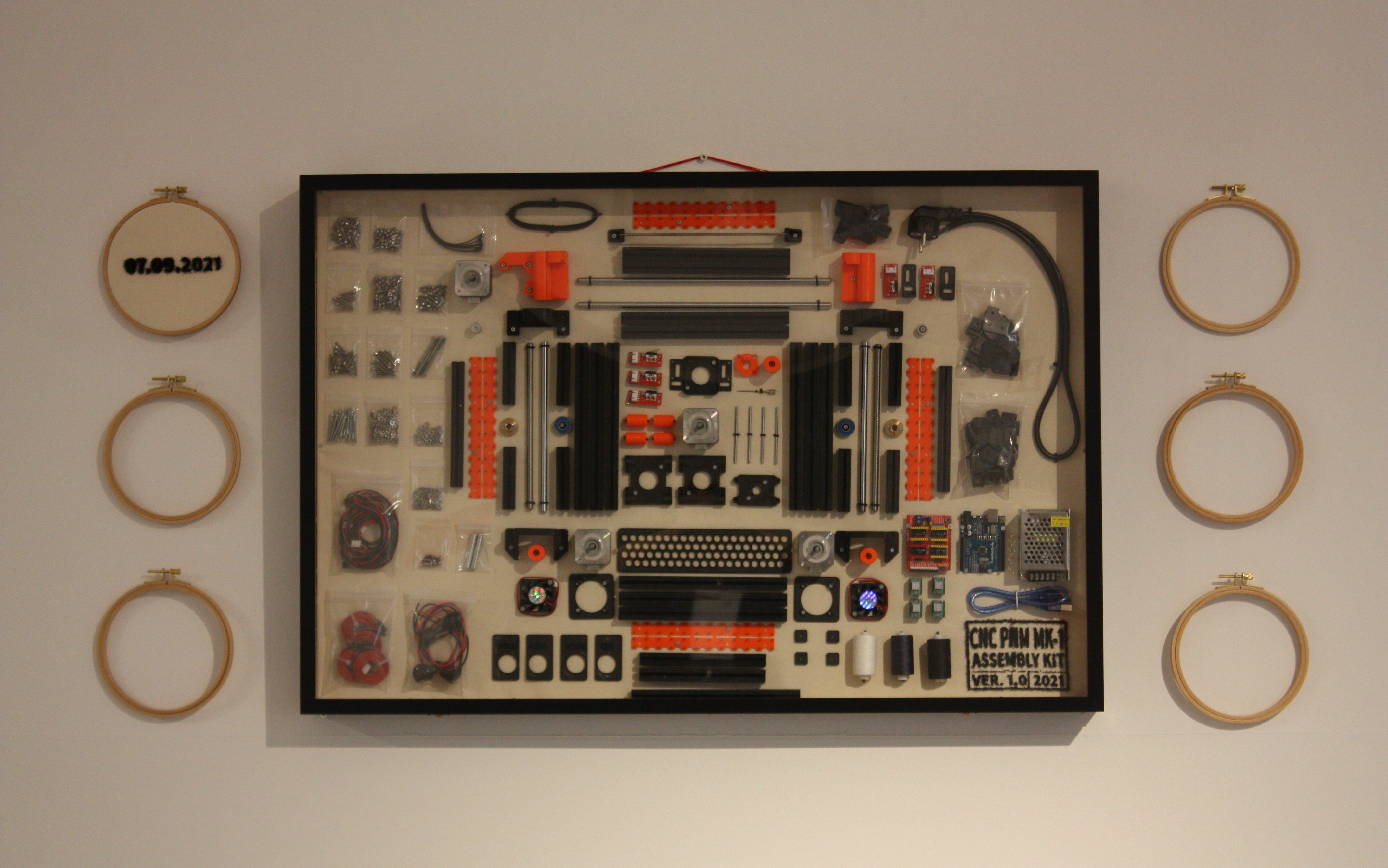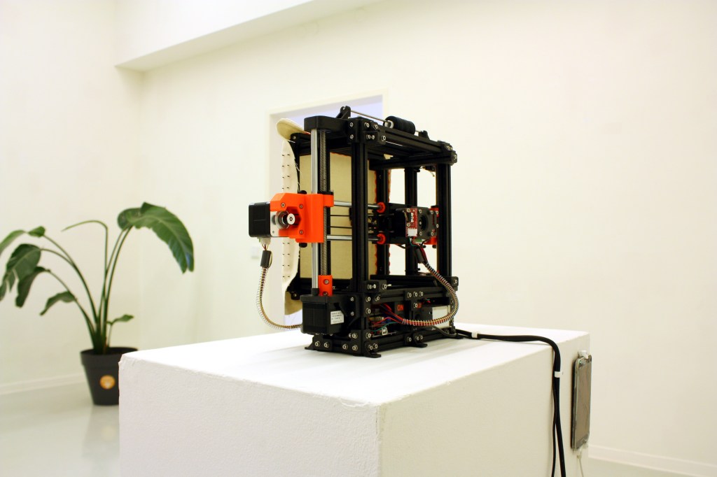 This embroidery machine—not far in nature from those that already exist in mass manufacturing warehouses—is here presented as an artwork, redirecting the artist’s questions from “results” to “processes”, from “means of production” to “reason”, emphasizing the artists’ ideas and intentions in the use of open-source technologies by artists. All components, software, and systems in this project originate from other existing open-source projects, therefore this artwork is not a product of the sole creativity of the artist, but an example of collective construction. The CNC Punch Needle Machine dreams of collective evolution over individual enlightenment. The CNC Punch Needle Machine MK-1 “punches” a small length of thread into a stretched canvas, and, dot by dot, it “prints” out texts or images.