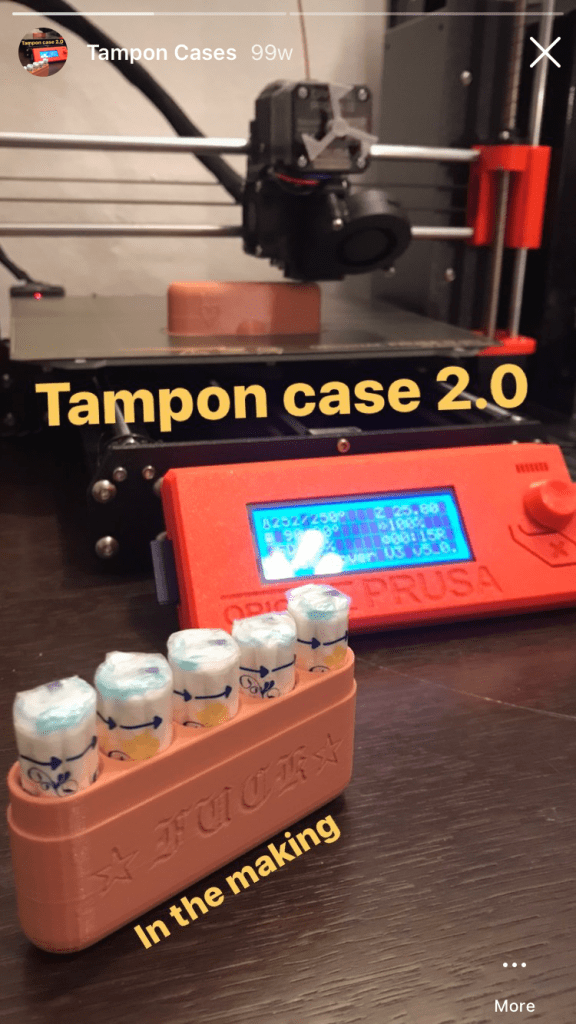 Out of 8 results for the search term “tampons”(“tampon case” did not return any results), two are actually related. Out of the two, one creator describes a “discrete” container for tampons, disguised as a marker pen.